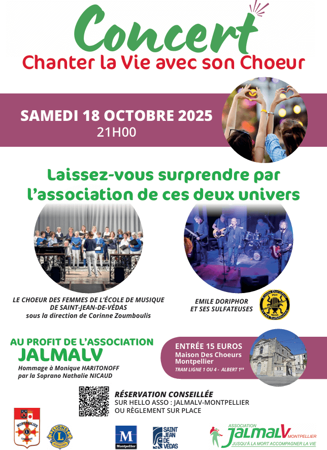 Retrouvez nous à la MAISON des CHOEURS à Montpellier le samedi 18 octobre 2025 à 21hoo Tram : ligne 1 ou 4 ( Albert 1er – Cathédrale) Laissez vous surprendre par l’association de ces deux univers : le Chœur de femmes de l’école de musique de Saint Jean de Védas et avec Emile Doriphor et […]