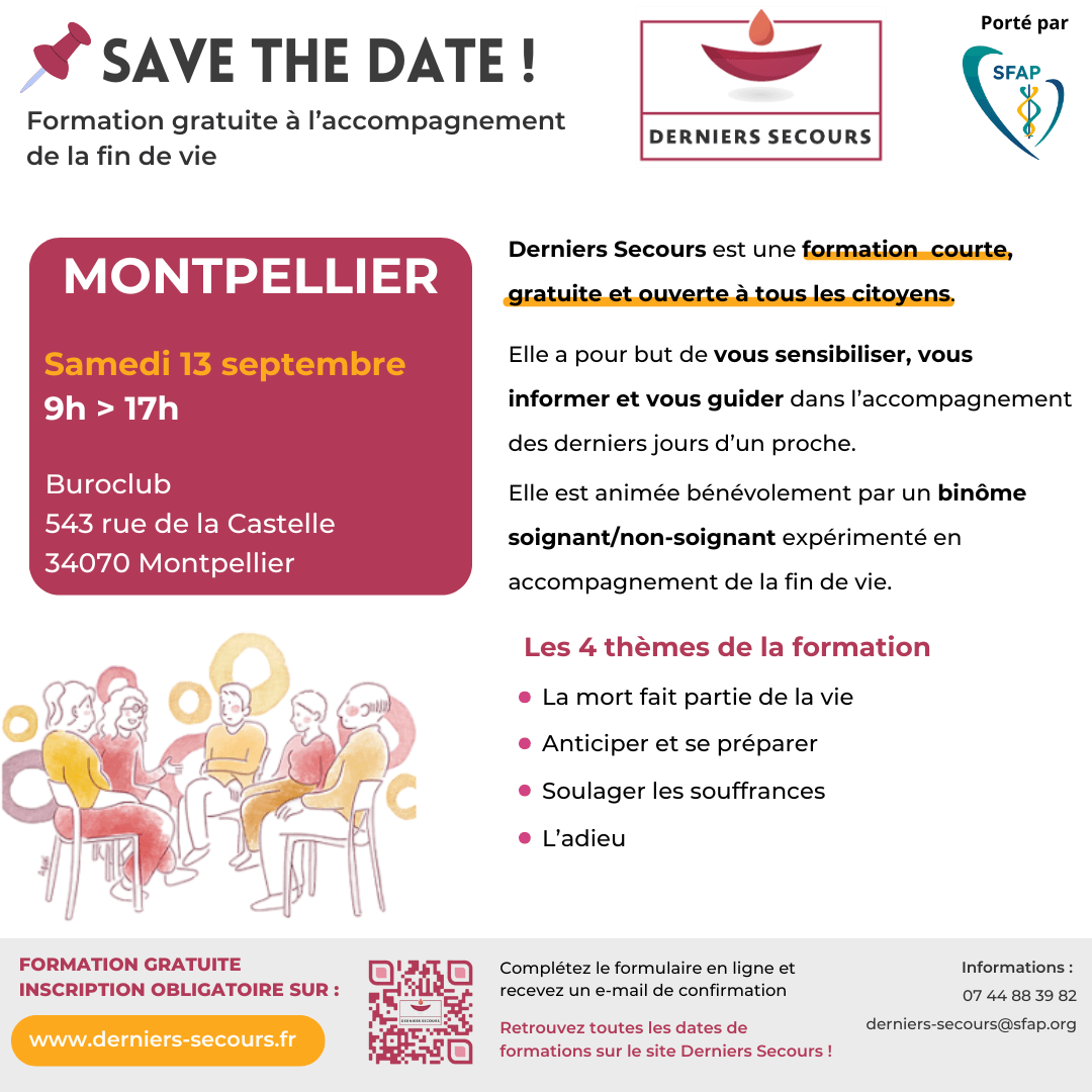Réservez votre journée du samedi 13 septembre pour une formation gratuite à l’accompagnement de la fin de vie, au siège de JALMALV-MONTPELLIER : Buro Club, 540 rue de la Castelle à Montpellier.